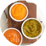 Marinerad kyckling med rismjöl, friterad och serveras med mango chutney och tamarinsås.