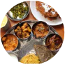 En smakrik tallrik med flera små rätter- Chicken Tikka Butter masala, Lamm curry och Räkor spenat. Naan + Raita ingår