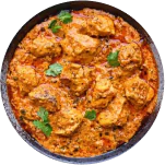 Gryta med vitlöksmarinerad kycklingfilé grillad i lerugn. Baltisås med krossade cashewnötter, paprika, lök, ingefära och färsk koriander